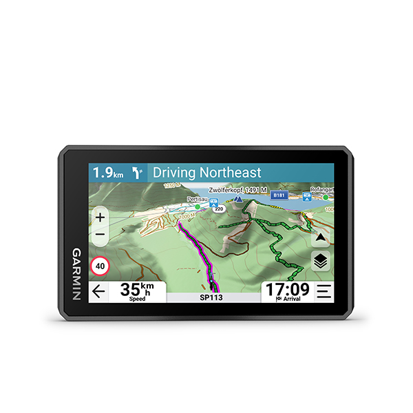 • Enhance your ride with compatible accessories, including zūmo™ R1 Radar, inReach® Mini 3 Plus satellite communicator (active satellite subscription required; some jurisdictions regulate or prohibit the use of satellite communication devices), Group Ride Tracker and Handlebar Controller (each sold separately)