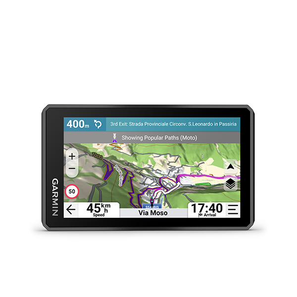 • Ride the more curvy, scenic, thrilling roads with the Garmin Adventurous Routing™ setting; find the best-rated routes from other riders with the great rides database via the Tread® smartphone app; see popular roads for riding on the map with popular moto paths
