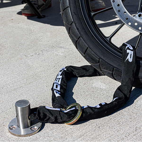 Secure your motorcycle with confidence using the RIDERR Ground Anchor - engineered for strength, durability and peace of mind. This robust security solution is built to deter theft and withstand serious force. Crafted from corrosion-resistant stainless steel, the lock body is built to endure harsh weather and resist cutting or sawing. A solid 10mm pin offers formidable resistance against bolt cutters and tampering. The included ground bolts anchor securely into concrete or other solid surfaces. Once installed, anti-tamper ball bearings lock the bolts in place. Keeping your lock mechanism clean with the integrated dust cover - protecting against dirt, water & debris. Perfect for garages, driveways & private parking spaces, pair it with your RIDERR Hardened Chain for maximum security.