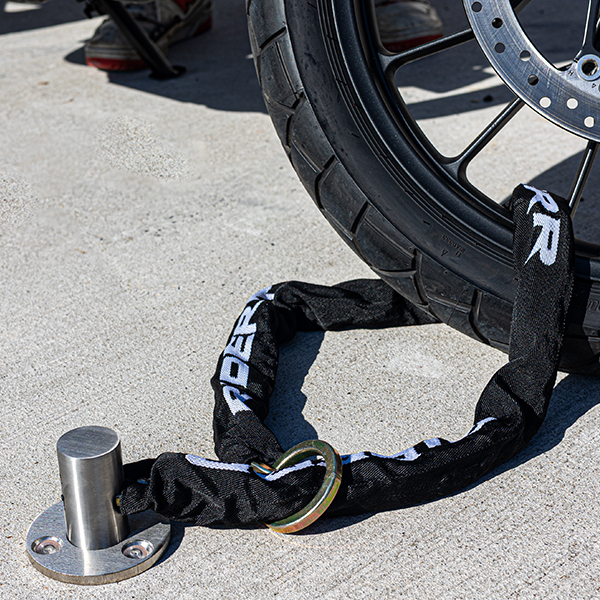 Secure your ride with confidence using the RIDERR Hardened Chain, built for serious protection and long-lasting performance. This chain is your ultimate anti-theft solution. Crafted from robust, hardened steel, the 10mm thick square chain resists cutting, sawing and prying for maximum defence. Featuring one circular ring end and one square end with beam, allowing secure loop-through locking. Wrapped in a premium quality canvas sleeve to prevent scratches & preserve your paintwork. Pair with the RIDERR Ground Anchor for that extra peace of mind.