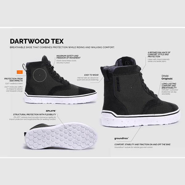 Designed for modern urban riders, Dartwood Tex are the certified aerated motorcycle shoes perfect for everyday wear during the warmer season. They combine protection with distinctive style and maximum comfort, on and off the saddle.
